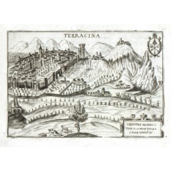 Terracina. "Terracina". Původní mědirytina, Pietro Bertelli, 'Theatrum Urbium Italicarum', Benátky, 1599. S rytým titulem, ornamentální kartuší a erbem. 12,5:18 cm.