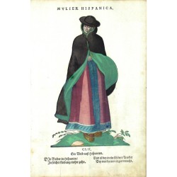 Amman, Jost (1539-1591). Španělsko. "Mulier Hispanica. Ein Weib auß Hispanien". Pův., skvostně staře kol. dřevořez, J. Amman z 1. vyd. jeho díla "Habitus praecipuorum populorum ... Trachtenbuch ...". Vyd. H. Weigel v Norimberku, 1577. 30,5:20 cm.