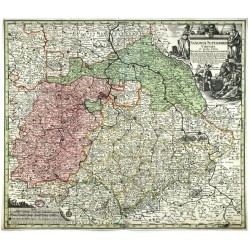 Jihovýchodní Německo (Sasko). "Saxoniae Superioris Circulus ...". Původní, staře kolorovaná mědirytina, M. Seutter, Augsburg, ca. 1730. S velkou figurální titulní kartuší s erbem a kartuší s měřítkem mapy. 50:58 cm.