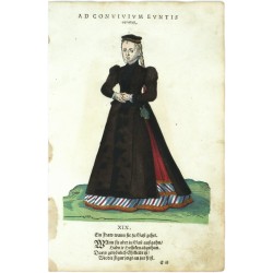 Jost Amman. "Ad Convivium Eunits ornatus. Ein Fraw wann sie zu Gast gehet". Pův. dřevořez, J. Amman z 1. vyd. jeho 'Habitus praecipuorum populorum ...'. Vyd. H. Weigel v Norimberku, 1577. Skvostné původní kolorování. 21,5:17 cm.