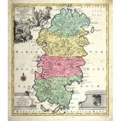 Sardinie. "Sardiniae Regnum et Insula". Pův., staře kol. mědirytina, Homannovi dědicové, Norimberk, 1734. S ornament. titulní kartuší s erbem a kartuší s pohledem na Cagliari. 56:47,5 cm.