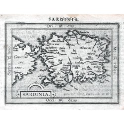 Sardinie (Sardegna - Itálie). "Sardinia". Pův. mědiryt z Orteliova atlasu "Epitome". Vyd. J. B. Vrienst v Antverpách, 1609. S ornament. tit. kartuší a titulem nad mapou. 8,5:12 cm.