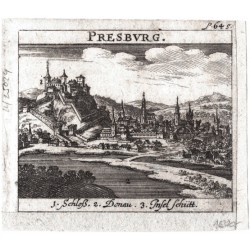 Bratislava. "Presburg". Pův. mědirytina z: G. Krekwitz "Totius Regni Hungariae ... Descriptio". Vyd. L. Loschge ve Frankfurtu nad Moahanem a Norimberku, 1686. S rytým titulem. 6,3:8,5 cm.
