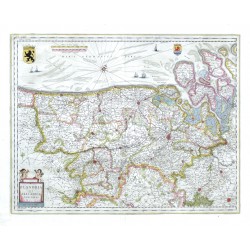 "Pictaviae ducatus descriptio, Vulgo le Pais de Poictou". Copper-engraving by W. J. Blaeu, published ca. 1650. Coloured. With title in great ornamental border, "Scala Miliarium Gallicorum" in figure cartouche, 2 coats-of-arms, a ship and...