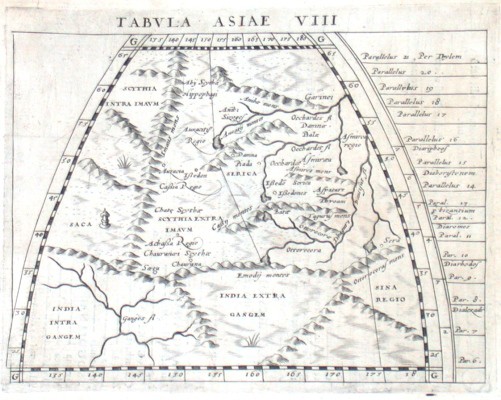 Indie, Čína, Himaláj, Nepál, Tibet. "Tabula Asiae VIII". Pův. mědiryt z G. A. Maginiho "Geographicae Cl. Ptolemaei ...". Vydal P. Keschedt, Kolín nad Rýnem, 1597. Podle C. Ptolemaiovy mapy regionu ryl G. Porro. 13,5:17 cm.