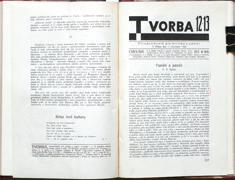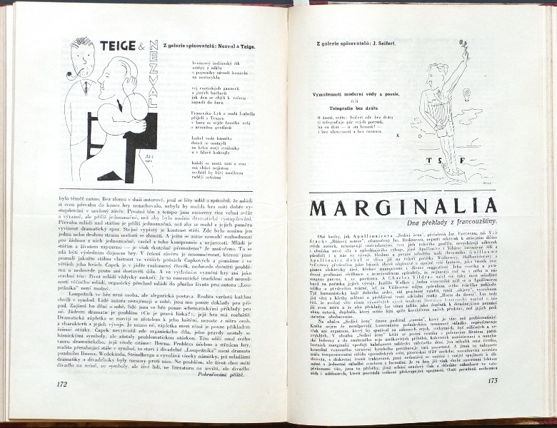 Tvorba. "Tvorba. List pro kritiku a umění". Praha: R. Škeřík - Symposion, 1925-26. 4°. (3), 250 str. Ill. A. Hoffmeister (15 karikatur spisovatelů a nakladatelů). Texty m. j. J. Honzl (3x), Jar. Seifert (2x), K. Teige (5x), Lad. Klíma (2x). Dobová polopl. vazba.