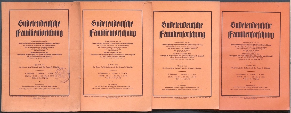 Sudetendeutsche Familienforschung. "Sudetendeutsche Familienforschung. Herausgegeben von der Zentralstelle für sudetendeutschen Familienforschung des Deutschen Verbands für Heimatforschung und Heimatbildung ... Mitteilungsblatt der Deutschen Gesellschaft für Familienkunde und Eugenik für die Tschechoslowakische Republik ... Geleitet von Dr. Franz Josef Umlauft und Dr. Franz J. Wünsch. 8. Jahrgang, 1935-36". Ústí nad Labem: nákladem vlastním, 1935-36. 8°. 4 sešity. 160 str. (stránkováno průběžně). OBrož.