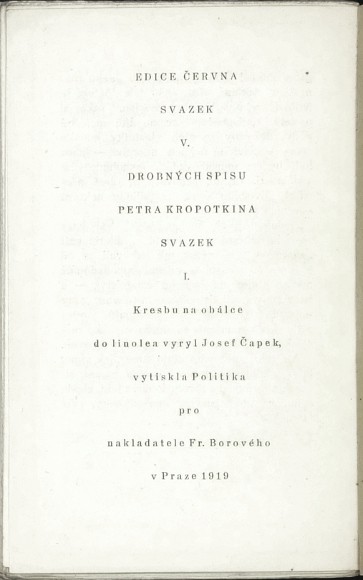 (Čapek). Kropotkin, Petr (1842-1921). "Anarchistická morálka. Komunism a anarchie. Velká revoluce". Praha: Borový, 1919. Edice Června, sv. V. 12°. 137, (1) str. Obálka J. Čapek. OIlBrož.