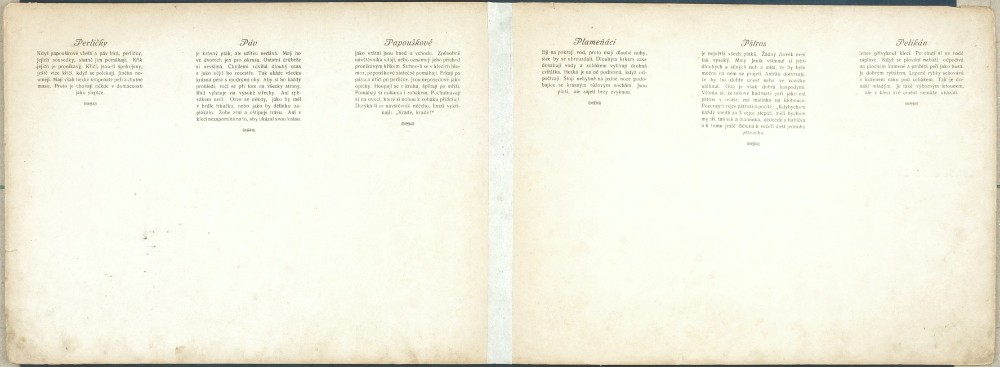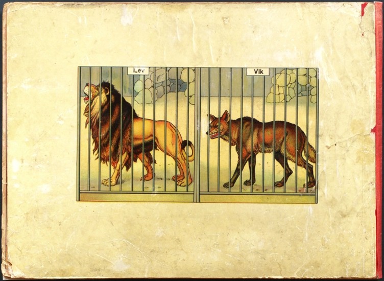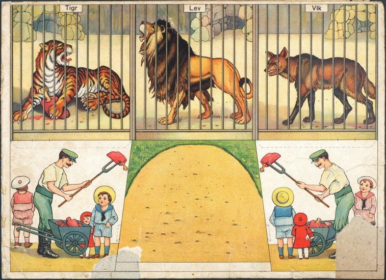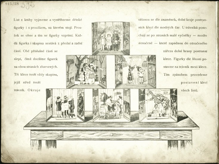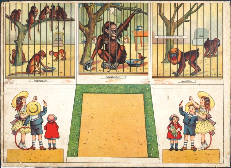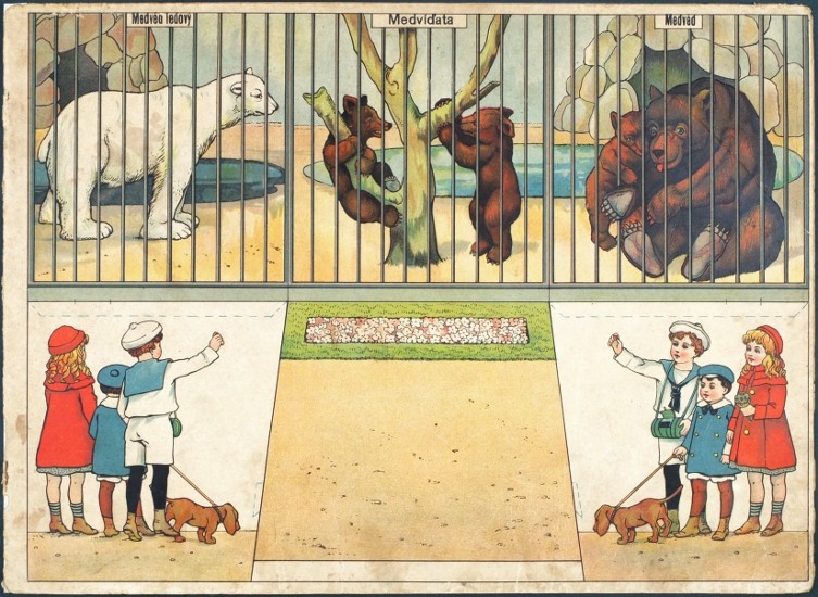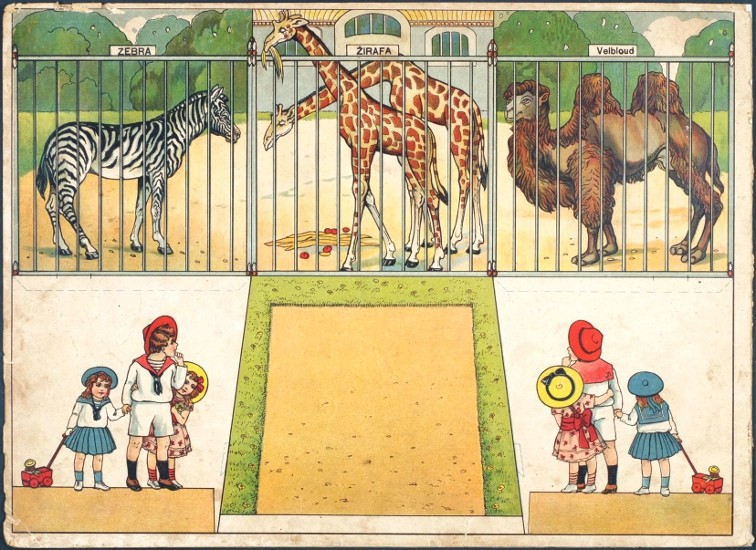"Rozestavovací zvěřinec". Rakovník: F. Příhoda, ca. 1910. Vystřihovací modely pro děti. 6 archů (každý 25:34 cm) spojených po dvou s krátkými doprovodnými texty na rubu. Barevné litografie na kartonu vložené ve stejně provedených orig. deskách.