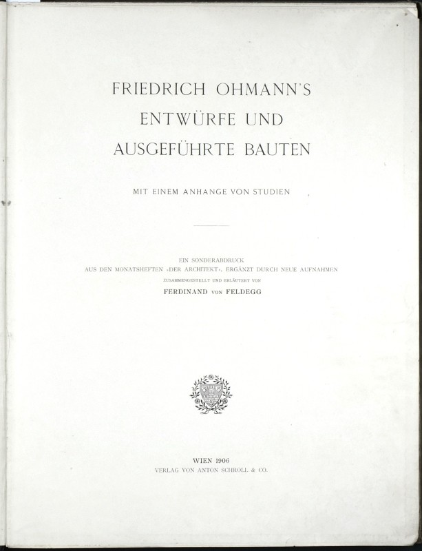 Ohmann, Friedrich (1858-1927); Feldegg, Ferdinand von (1855-1936). "Friedrich Ohmann's Entwürfe und ausgeführte Bauten. Mit einem Anhange von Studien. Ein Sonderabdruck aus dem Monatsheften 'Der Architekt', ergänzt durch neue Aufnahmen. Zusammengestellt und erläutert von Ferdinand von Feldegg". Vídeň: Schroll, 1906. Folio. (1 l. - titul), 160 str. s množstvím architektonických vyobrazení (6 barevných) a nákresů. O. polpl. vazba se zlacením na hřbetu.