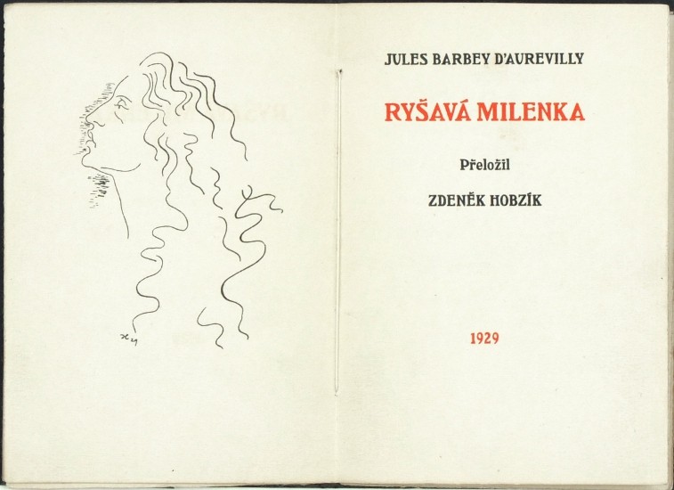 Barbey d'Aurevilly, Jules (1808-1889). "Ryšavá milenka". Praha: Neumann, 1929. "Knížky pro potěšení", sv. 8. 16°. 22, (2) str.. se 3 perokresbami V. Hrsky. Ex. č. 39 z 300 výtisků vydání C (celkový náklad byl 360 ex.) na českém ručním papíru. Sešité archy volně vložené v dobové černé obálce.