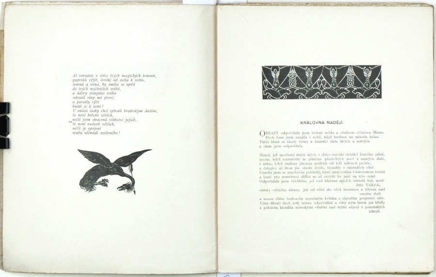 (Karel Hlaváček). Březina, Otokar. "Větry od pólů. Ornamentace od Karla Hlaváčka". Praha: Moderní Revue, 1897. Knihovna Moderní Revue, sv. 17. 1. vydání. 4°. Nestránkováno (41 str.). Výzdoba Karel Hlaváček. OBrož.