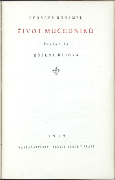 (Čapek). Duhamel, Georges (1884-1966). "Život mučedníků (Ze života mučedníků)". Praha: A. Srdce, 1919. 8°. 103, (2) str., celostr. linoryt J. Čapka. Dobová polopl. převazba, pův. il. obálka (linoryt J. Čapka) vevázána.