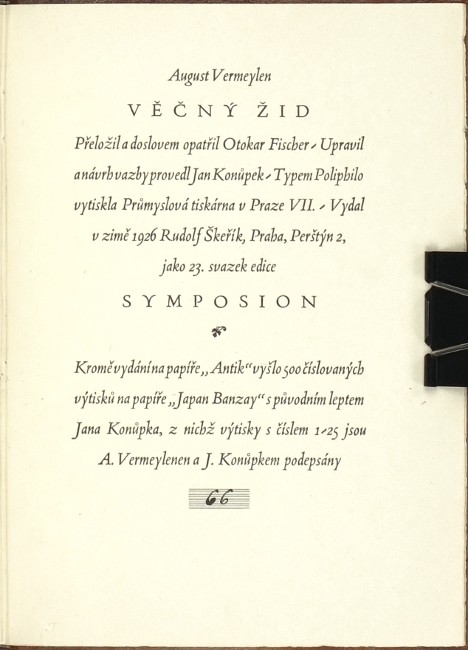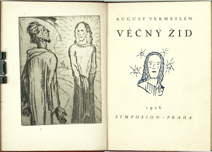 (Jan Konůpek). Vermeylen, August (1872-1945). "Věčný Žid". Praha: R. Škeřík, 1926. Ed. "Symposion", sv. 23. Přednostní výtisk čís. 66/500 na papíře Japan Banzay. 8°. 170, (3) str. Úprava, návrh vazby a lept ve frontispisu J. Konůpek. Tlač. celokož. vazba.