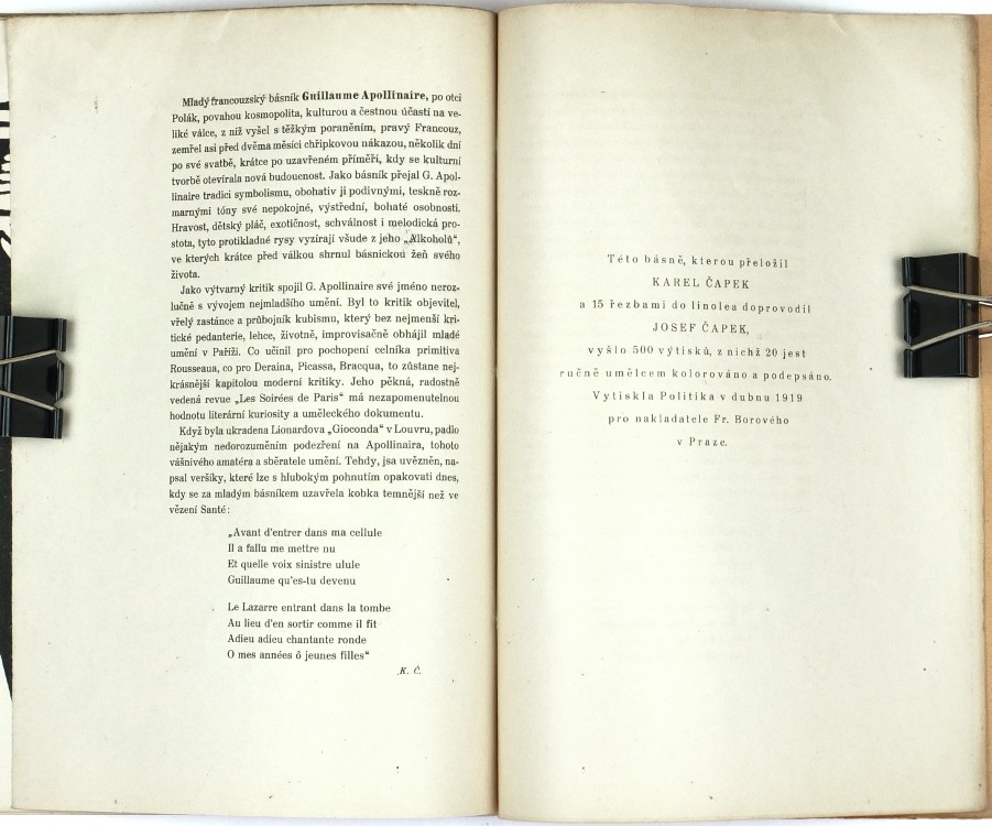 (Josef Čapek). Apollinaire, Guillaume. "Pásmo". Praha: Borový, 1919, vytiskla Politika. Vydáno v 500 výtiscích. 4°. 15, (2) str. s 15 původními linoryty J. Čapka (na přední straně obálky tištěný červenou barvou, ostatní v textu, z toho 2 celostránkové). Přeložil a doslov napsal Karel Čapek. OIlBrož.