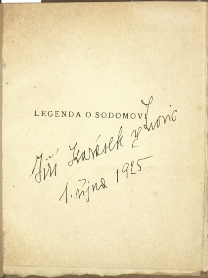 (František Kobliha). Karásek ze Lvovic, Jiří (1871-1951). "Legenda o Sodomovi". Praha: Bradáč, 1920. Ed. Vybrané knihy, sv. XXIV. 12°. 35, (4) str. Upravil a dřevoryty vyzdobil F. Kobliha. Pův. poloperg. vazba.