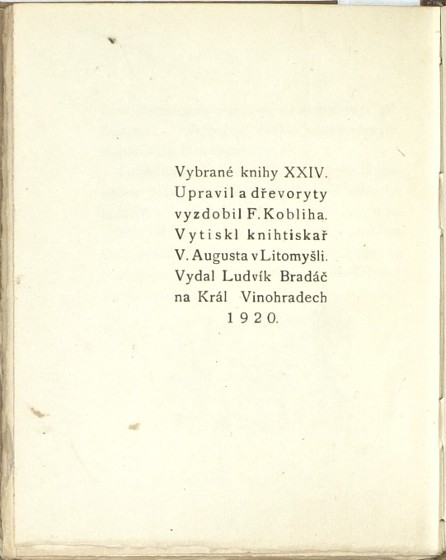 (František Kobliha). Karásek ze Lvovic, Jiří (1871-1951). "Legenda o Sodomovi". Praha: Bradáč, 1920. Ed. Vybrané knihy, sv. XXIV. 12°. 35, (4) str. Upravil a dřevoryty vyzdobil F. Kobliha - celostr. ve frontispisu (tužkou signováno), celostr. titul a iniciála (kolorovaná) na str. 8. Pův. polopergamenová vazba se zlaceným titulem na hřbetu.