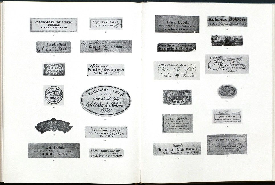 Původní monografie, opírající se převážně o pramenný materiál, pojednává o životě a práci 1200 mistrů houslařů, žijících na území Čech, Moravy a Slovenska v minulosti i současnosti. Úvodní přehledná studie seznamuje s vývojem čs. nástrojařství. Podstatnou část rozsahu tvoří dokonalé snímky výrobků, reprodukce vinět a obrysy houslí, viol a violoncell. - Přebal poškozen a vyspraven, jinak čisté a velmi dobře zachováno.