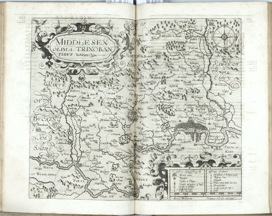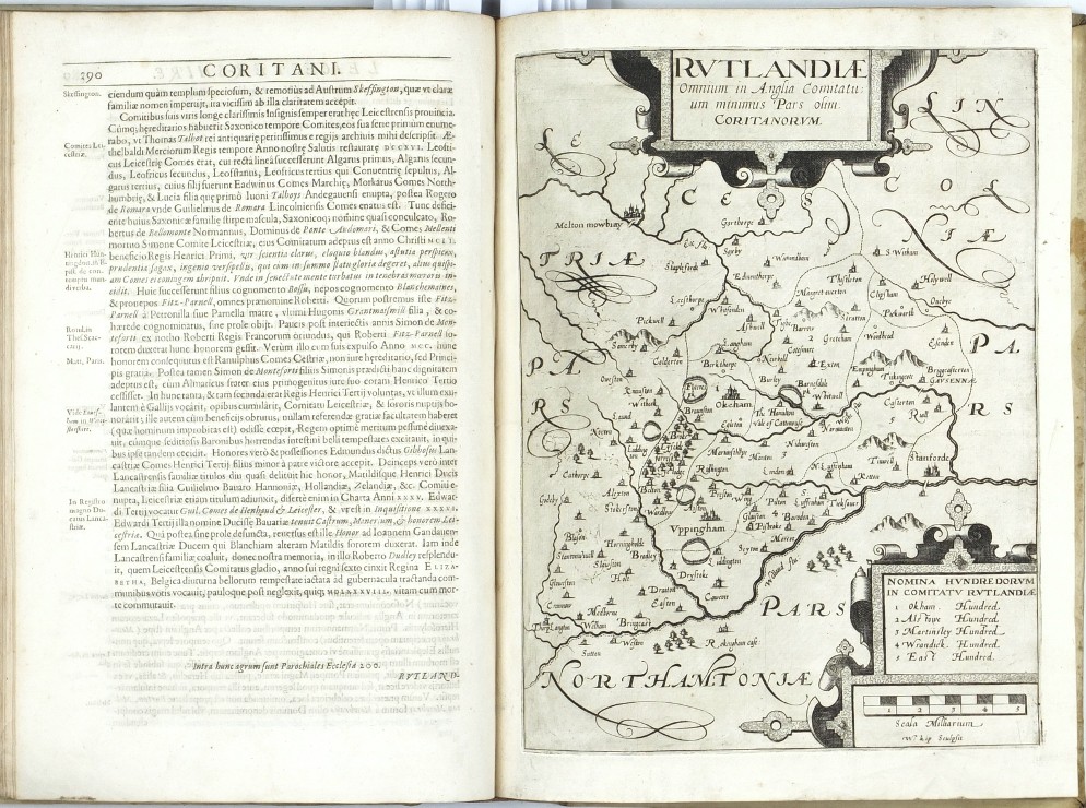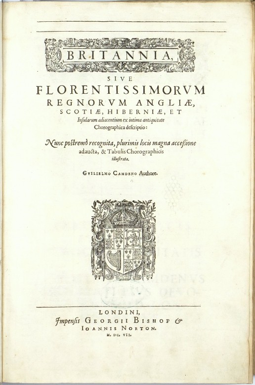 Camden, William. Britannia. První vydání s mapami hrabství. "Britannia, sive Florentissimorum regnorum Angliae, Scotiae, Hiberniae, ...". Londýn: Bishop a Norton, 1607. Fol. (16), 860, (24) str. s rytým titulem, 57 mědirytinovými mapami, 8 celostr. mědiryt. tabulemi mincí a množstvím dřevořez. il. v textu. Dobová celoperg. vazba.