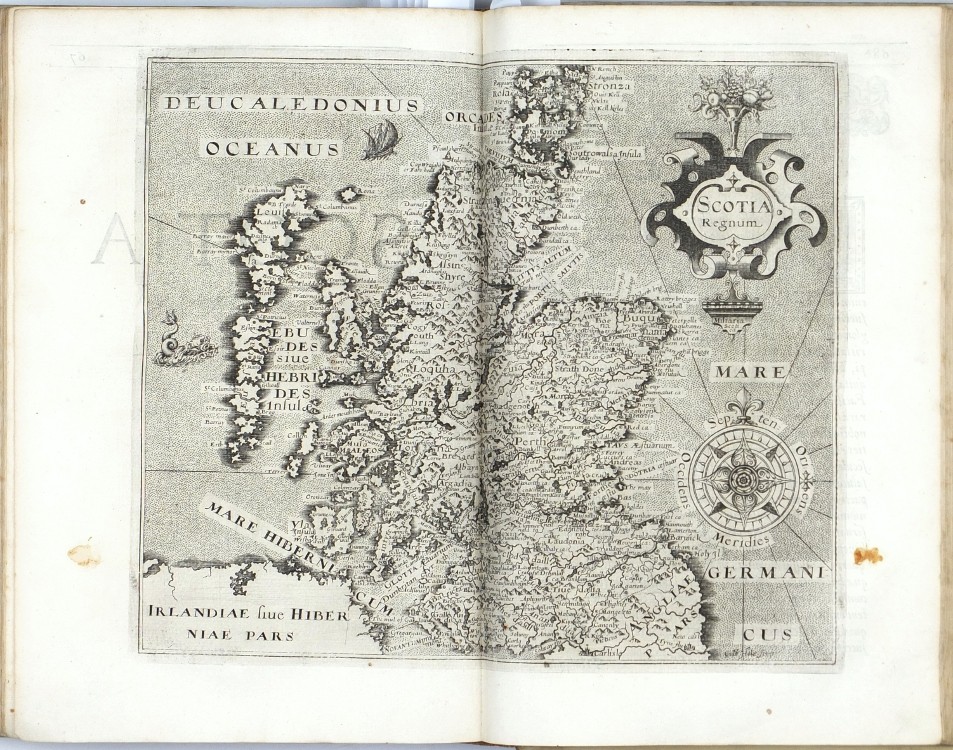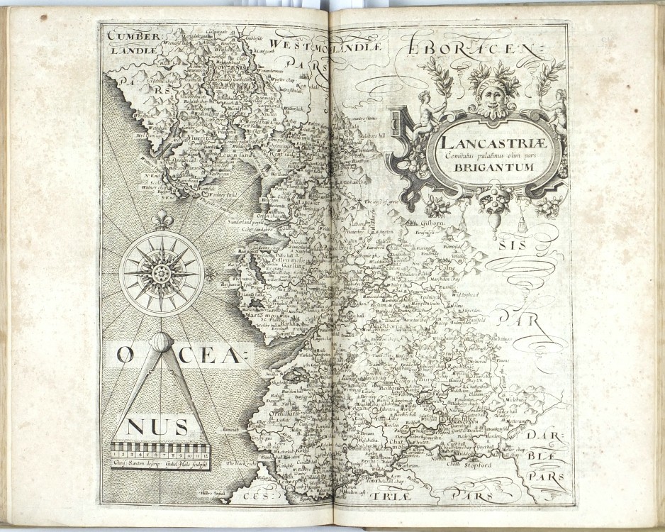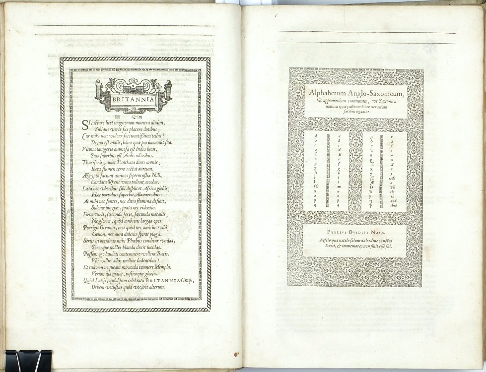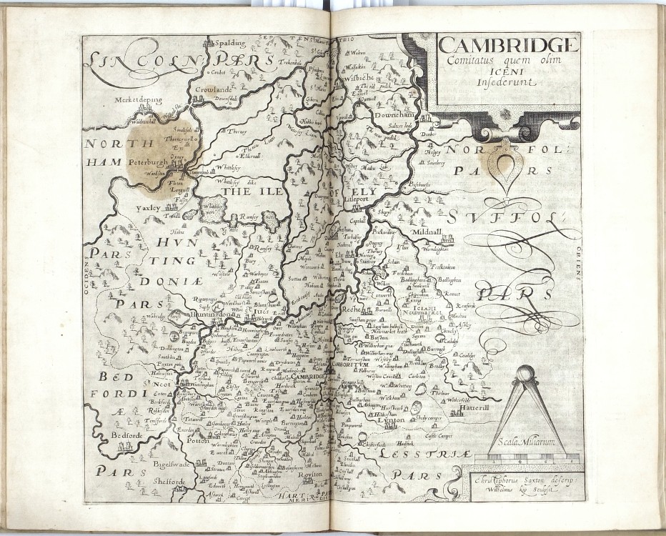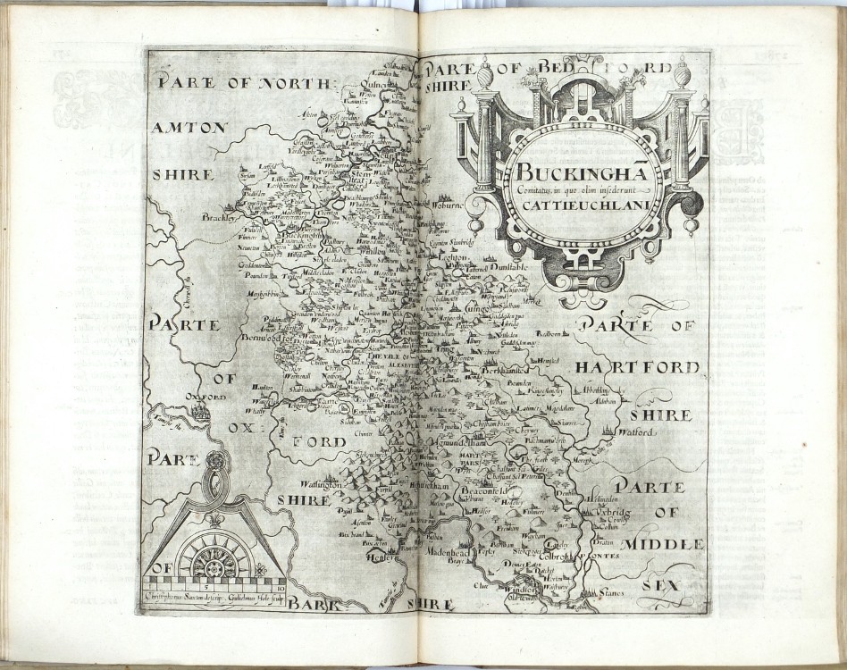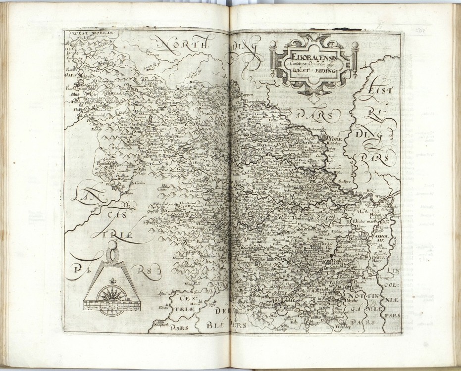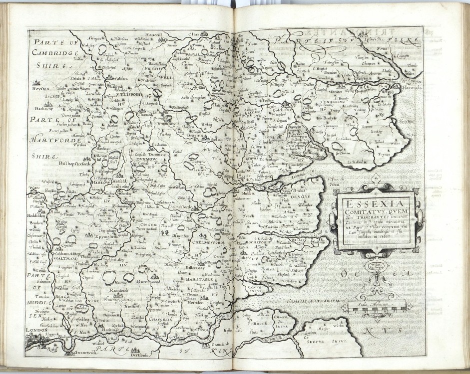 Šesté latinské vydání velkého alžbětinského topografického a historického přehledu Británie, poslední vydané za Camdenova života a první, které obsahuje mapy hrabství (54 z nich je dvoustránkových, 3 jednostránkové). Mapy vyryli William Hole (21) a William Kip (34) podle map Christophera Saxtona (41) a Johna Nordena (6). George Owen přispěl mapou hrabství Pembrokeshire. Ostatní nejsou signovány, mapy Anglie, Skotska a Irska jsou odvozeny od map Mercatorových. - Mapa 'Cambridge' (str. 354-355) s hnědou skvrnou, jinak čisté a velmi dobře zachováno.