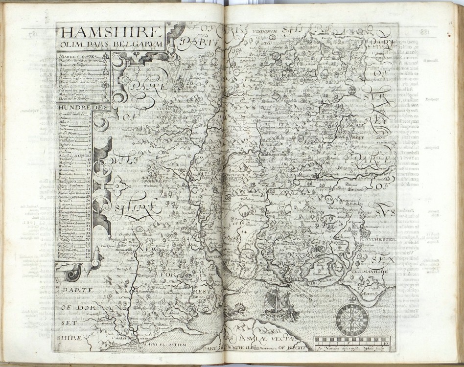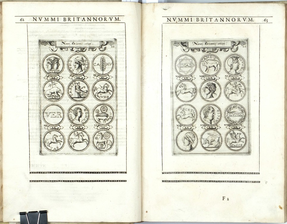 Camden, William. Britannia. První vydání s mapami hrabství. "Britannia, sive Florentissimorum regnorum Angliae, Scotiae, Hiberniae et Insularum adjacentium ex intima antiquitate chorographica Descriptio: Nunc postremo recognita, plurimis locis magna acessione adauct, & Chartis chorographicis illustrata ...". Londýn: George Bishop a John Norton, 1607. Folio. (16), 860, (24) str. (s obvyklými chybami ve stránkování) s celostránkovým rytým titulem / frontispisem ('Britannia' - mapa Velké Británie v alegorické borduře), 57 mědirytinovými mapami, 8 celostr. mědirytinovými tabulemi mincí (str. 62-69), celostr. mědirytinou Stonehenge (str. 183) a množstvím dřevořezových ilustrací v textu (Římské nápisy, vyobrazení Rollright Stones atd.). Dobová celopergamenová vazba.