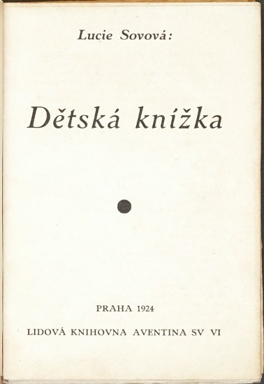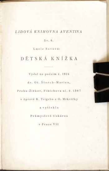 (Teige - Mrkvička). Sovová, Lucie (t. j. Františka Benešová, 1891-1962). "Dětská knížka". Praha: Dr. Ot. Štorch-Marien (Aventinum), 1924. Ed. 'Lidová knihovna Aventina', sv. 6. Úprava a obálka Karel Teige, Otakar Mrkvička. 12°. 56, (3) str. OIllBrož.