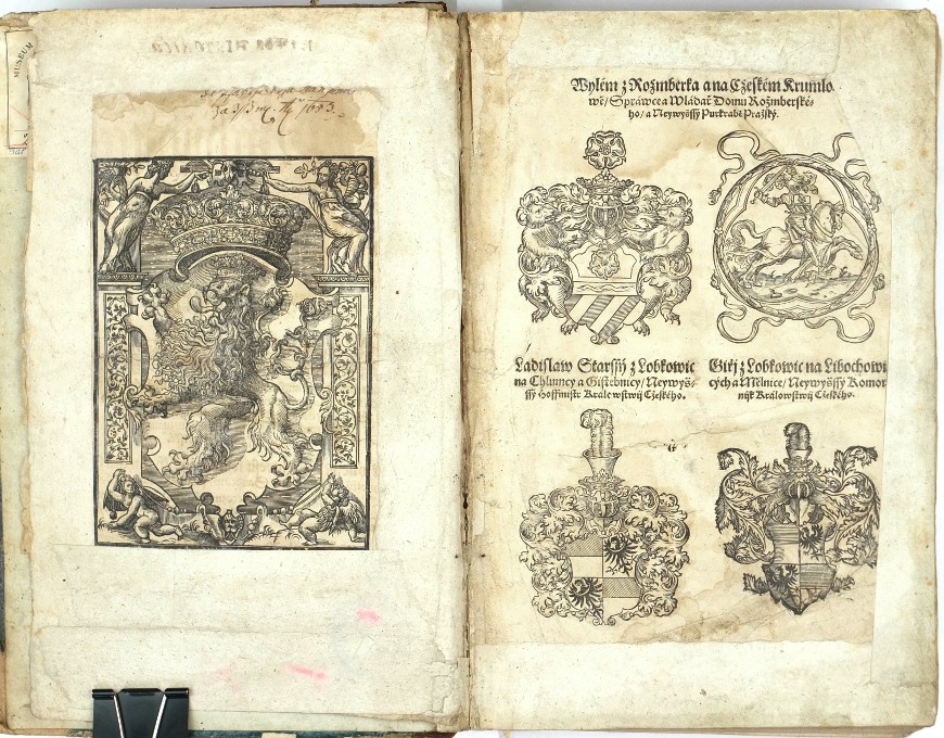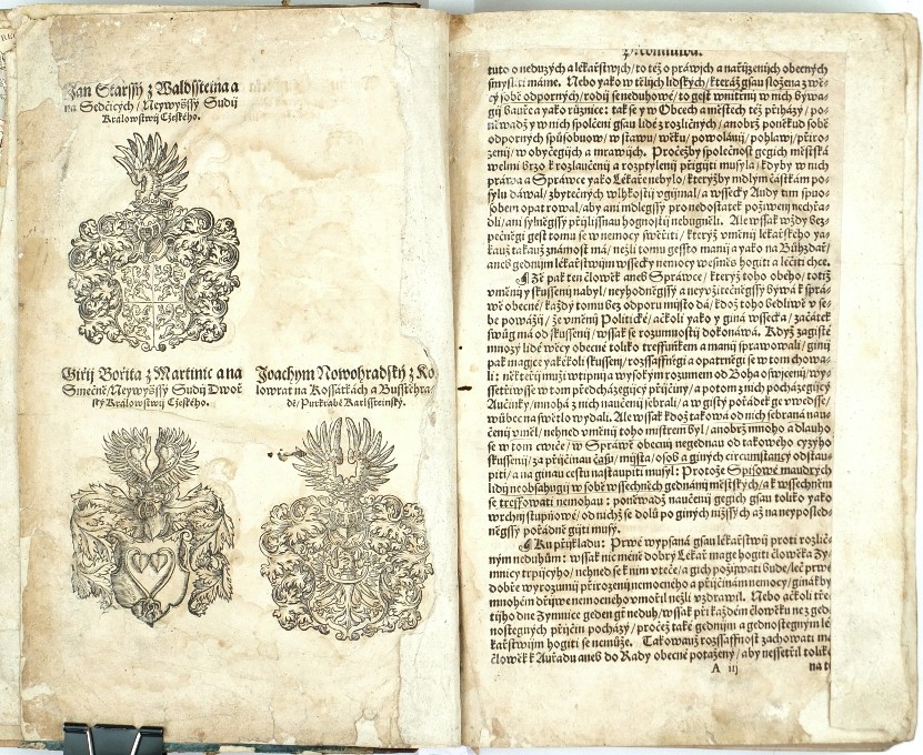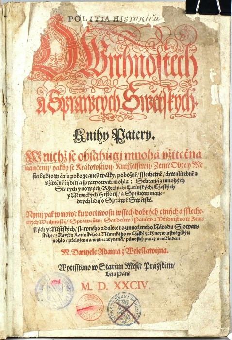 Lauterbeck, Georg (asi 1505 - 1578). "Politia Historica. O Wrchnostech a Sprawcých Swětských. Knihy Patery. W nichž se obsahugj mnohá vžitečná naučenij, gakby se Králowstwij, Knijžetswij, Země, Obce y Města buďto w času pokoge aneb wálky, pobožně, sslechetně, chwalitebně a vžitečně řjditi a sprawowati mohla: Sebraná z mnohých Starých y nowých, Ržeckých, Latinských, Cžeských y Německých Historij, a Spisůw maudrých lidj o Spráwě Swětské. Nynij pak w nowě ku poctiwosti wssech dobrých ctných a sslechetných Wrchnostij, Spráwcůw, Saudcůw, Panůw a Vřednjkůw Zemských y Městských, slawného a dalece rozmnoženého Národu Slowanského, z Yazyka Latinského a Německého w Cžeský yakž neywlastněgi býti mohlo, přeložená a wůbec wydaná, pilnostj, pracý a nákladem M. Danyele Adama z Weleslawijna". Praha: Daniel Adam z Veleslavína, 1584. 1. české vydání. Fol. (10 místo 14), 732, (22 místo 31) str. Na rubu titulního celostr. dřevořez Českého lva (16,5 x 11,5 cm), za ním list se 7 dřevořezovými erby (2x Vilém z Rožemberka, Ladislav st. z Lobkovic, Jiří z Lobkovic, Jan st. z Valdštejna, Jiří Bořita z Martinic, Joachim Novohradský z Kolovrat) české šlechty (t. j. A(1)V - má být vevázán za předmluvou), množství dřevořezových iniciál v textu. Polokožená vazba 18. stol.
