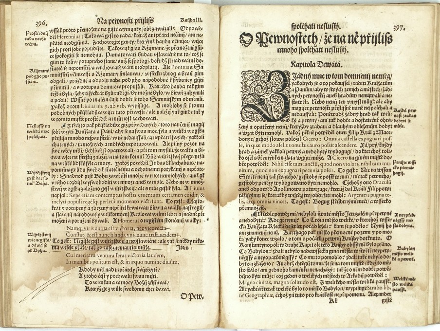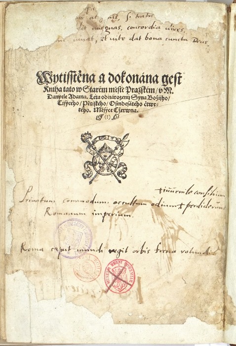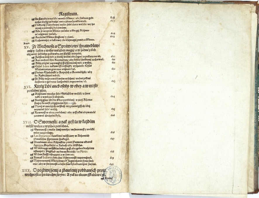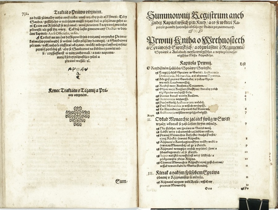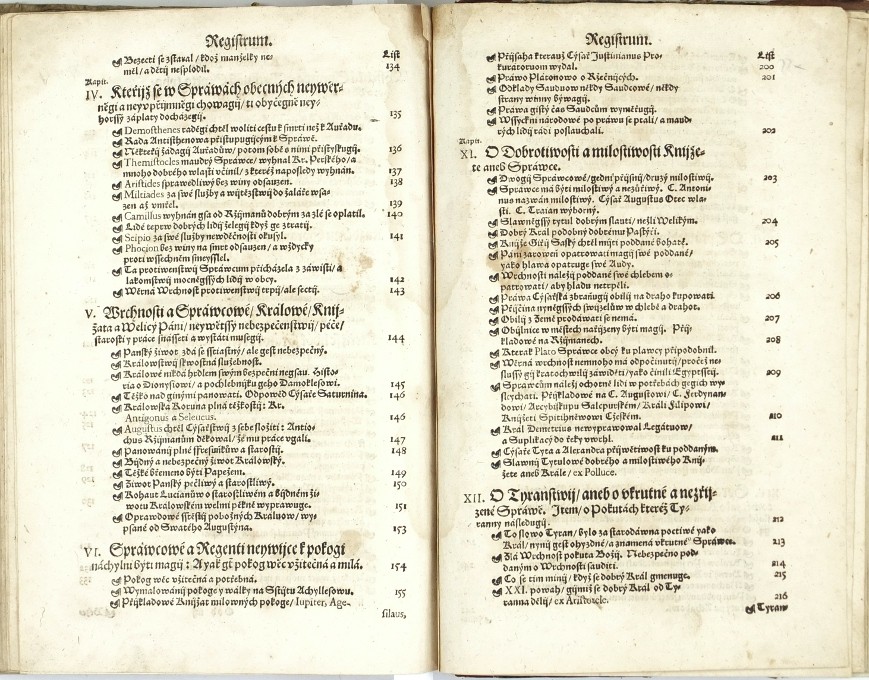 Knihopis 04735. - Veleslavínův překlad (adaptace) Lauterbeckova díla 'Regentenbuch ...'. Raně novověké dílo (poprevé vyšlo německy 1556) o vládnutí a správě států, knížectví, zemí a měst, a to jak v dobách míru, tak války. Kniha je důležitým příkladem politické literatury 16. století. - Vazba poškozena. Na několika stranách dobové vpisky a podtržení, na začátku a na konci stará knihovnická razítka. Chybí 1. list předmluvy (A(1) I), 1 list s dřevořezovými erby (A(1) VII) a 4 listy Registru (Ooo II, Ooo V, Qqq II - Qqq IV). Prvních 7 listů v okrahích potrháno a amatérsky vyspraveno. Průběžně poněkud zahnědlé, na prvních 7 listech a na stranách 381-414 znatelněji. Poslední list (kolofon) v okrajích potrhán a staře podlepen.