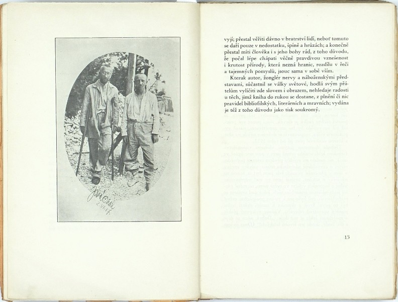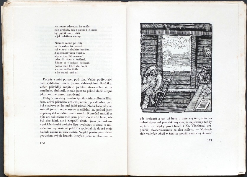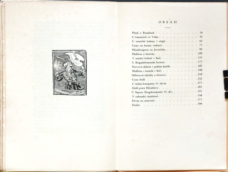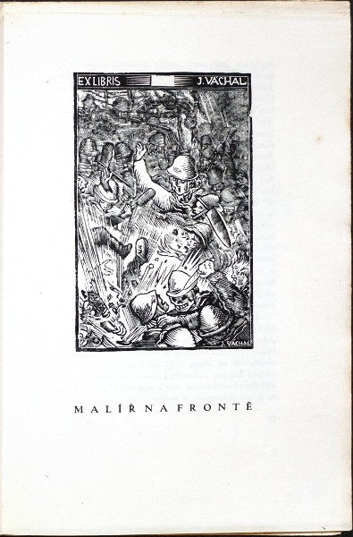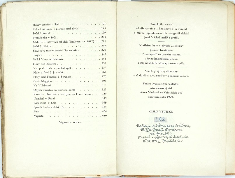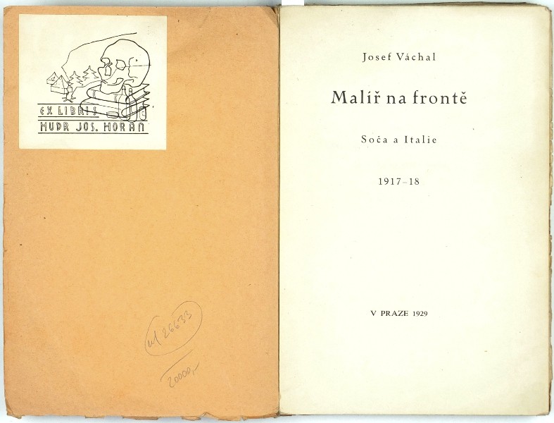 Váchal, Josef. "Malíř na frontě. Soča a Italie 1917-18". Praha: A. Macková jako soukromý tisk, 1929. 8°. 403, (7) str. se 42 pův. dřěvoryty, 1 linorytem a 4 fotoreprodukcemi. V tiráži autorovo rkp. věnování. Výtisk čís. 282/300 na dřevaprostém papíře. OIllBrož.