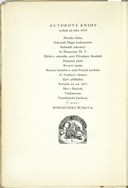 V tiráži autorova pětiřádková dedikace perem Dru. J. Moranovi (jeho exlibris na rubu přední strany obálky), Váchalovu a Mackové jičínskému lékaři, známemu také jako poslední velitel Riegrovy skautské oblasti ('Našemu milému panu doktorovi, MUDr. Josefu Moránovi na památku připsal alešovských dnech, dne 15. XI. 1952 J. Váchal'). - Obálka v okrajích s drobnými trhlinkami (vpředu vlevo nahoře jedna větší - ca. 1 cm), jinak dobře zachováno.