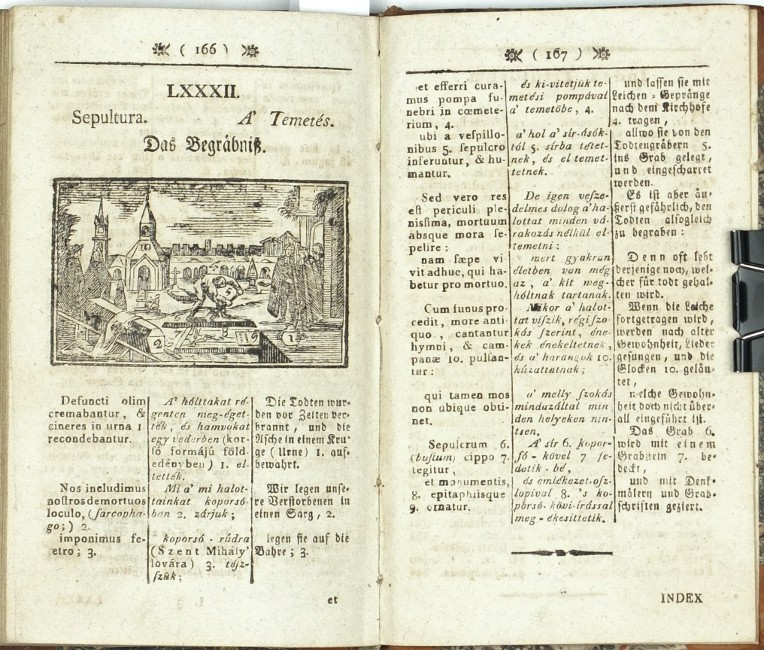 Komenský, Jan Amos (Comenius). "Orbis Pictus, in Hungaricum et Germanicum translatus ... A' Vilag Le-Festve. Magyarra fordíttatott, és hellyel-hellyel meg-jobítatott Sz. J. által Sz. Patakon 1796-dik eszt. Die Welt in Bildern. In die Ungarische und Deutsche Sprache übersetzt und hin und wieder verbessert". Bratislava: Weber, 1798. 12°. 167, (1) str. s rytým titulem a 82 dřevořezovými vyobrazení (ryl G. Sturm) v textu. Třísloupcový tisk (latinský, maďarský a neměcký). Dobová polokožená vazba.