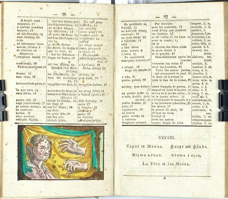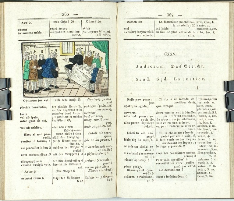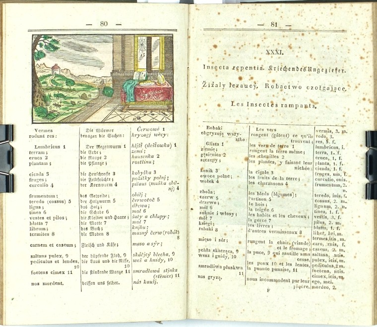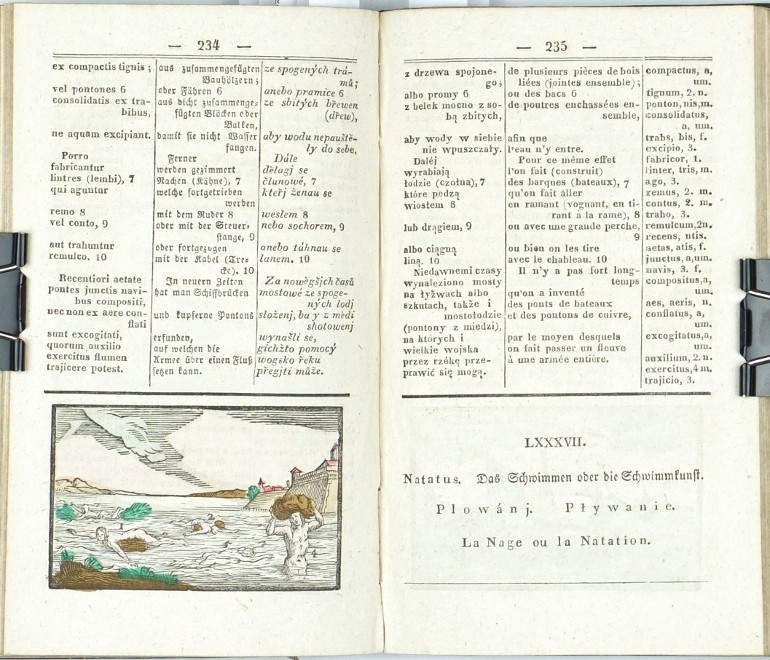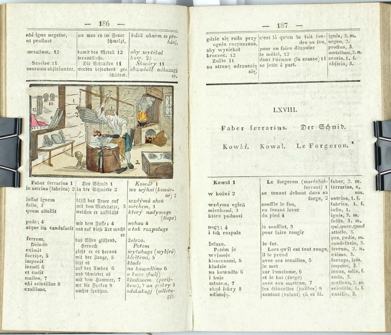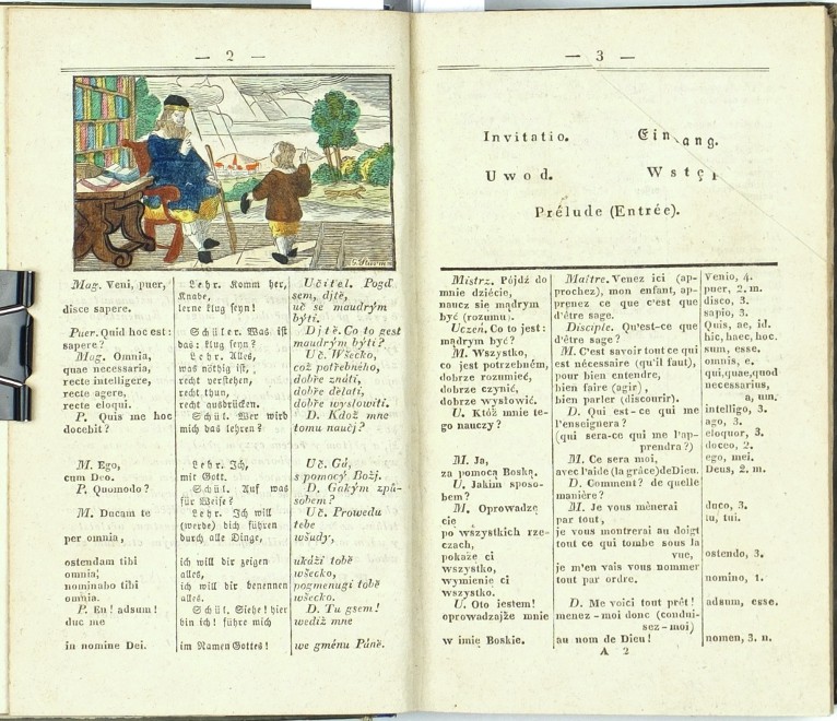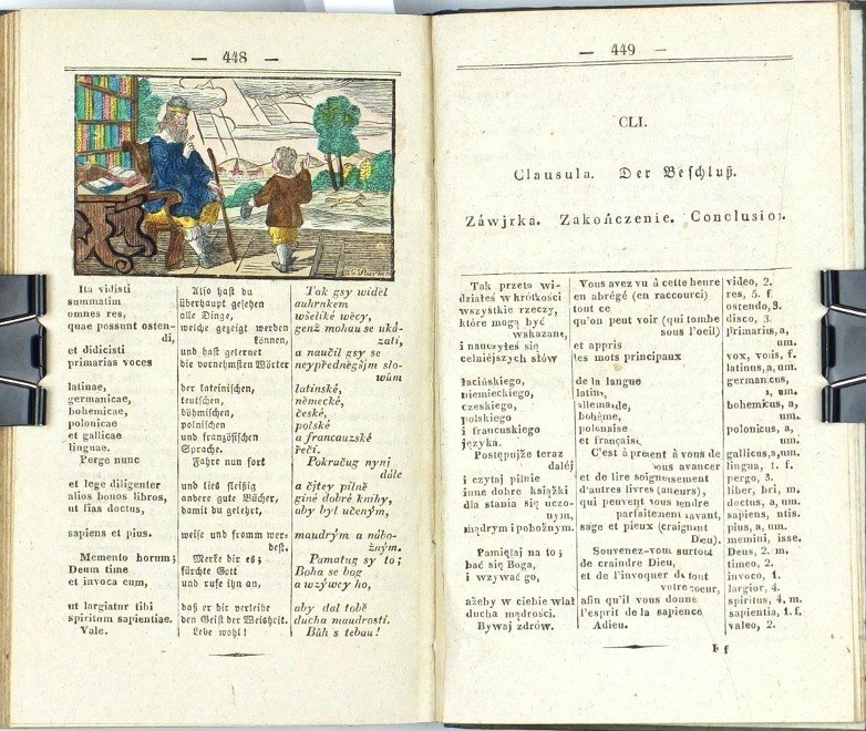 Komenský, Jan Amos (Comenius). "Orbis Pictus. Die Welt in Bildern. Swět v obrazých. Swiat w obrazach. Le Monde en Tableaux". Hradec Králové: J. H. Pospíšil, 1833. 8°. (2) ll., XVI, 454, (4) str. se staře kolorovanou vinětou na titulu a 54 staře kolorovanými dřevorytovými vyobrazeními (ryl G. Sturm) v textu. Šestisloupcový tisk (latinsky, neměcky, česky, polsky, francouzsky a lat. slovesa a podstatná jména v 1. osobě, resp. 1. pádě). Původní papírová vazba se zlatě raženým titulním štítkem na hřbetu.