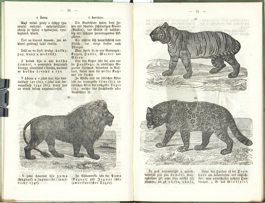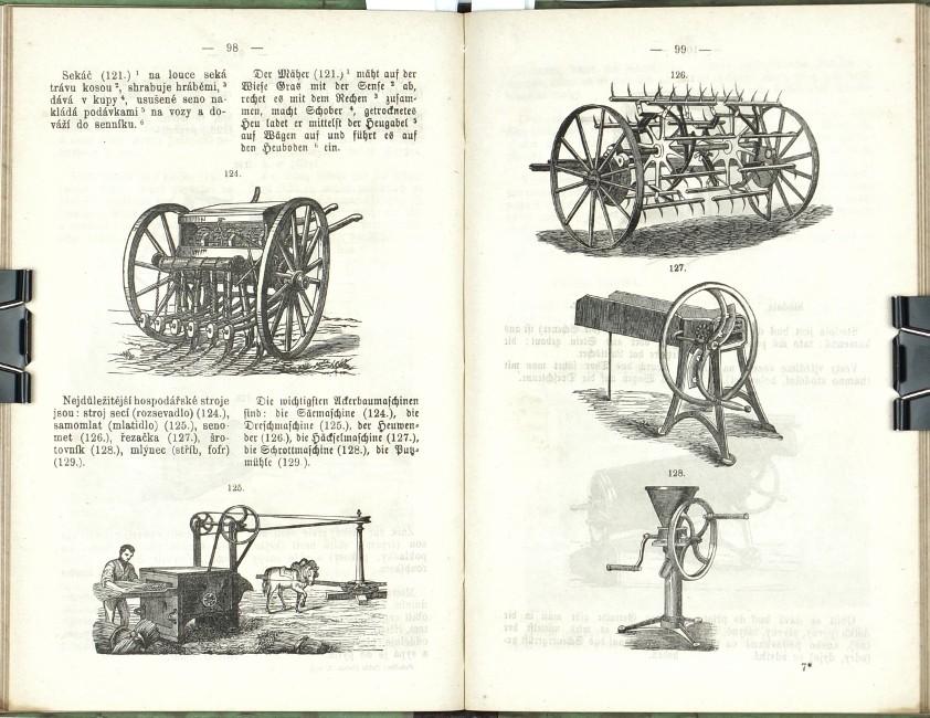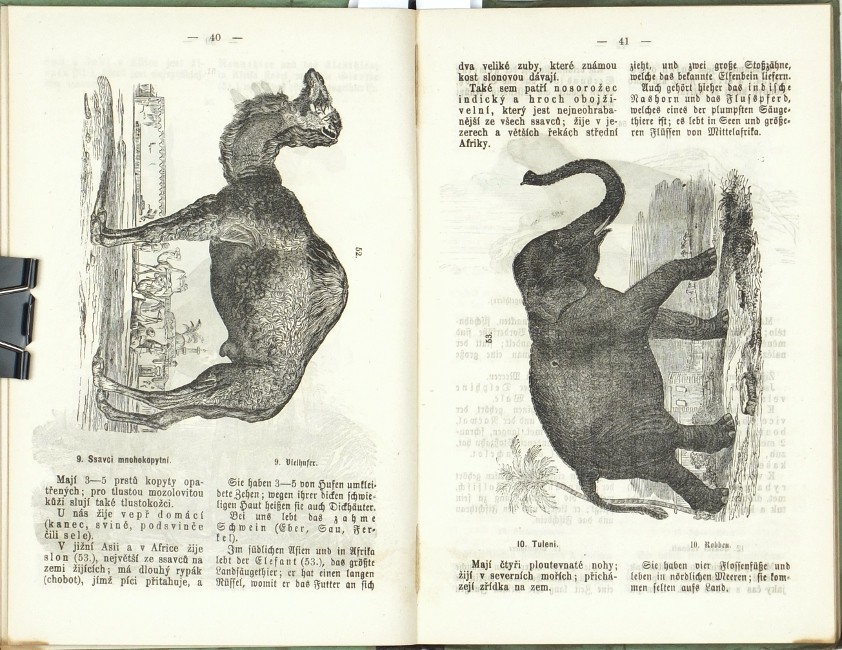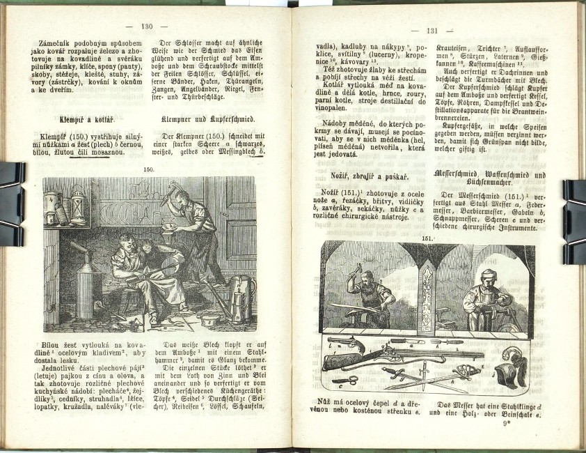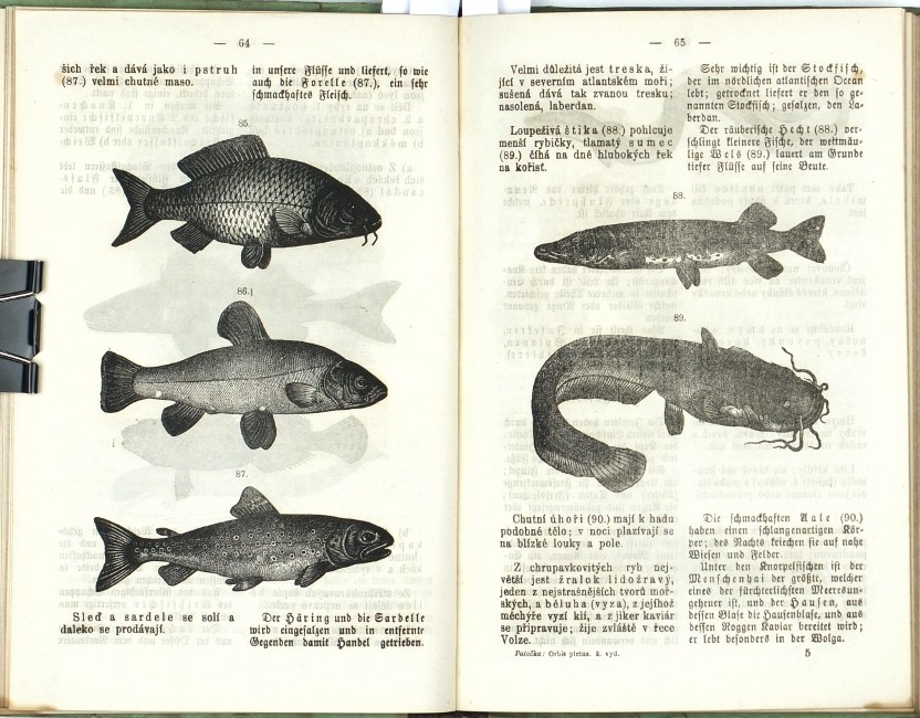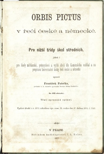 (Komenský, Jan Amos). Patočka, František. "Orbis Pictus v řeči české a německé. Pro nižší třídy škol středních, jakož i pro školy měšťanské, průmyslové a vyšší dívčí školy dle Komenského vzdělal a za propravu konversační knihy řeči české a německé upravil ... Patočka". Praha: Kober, 1877. 3. vydání. 8°. VI, 190, (3) str. se 179 xylografickými ilustracemi v textu. Dvousloupcový tisk (česky a německy). Pův. ilustrovaná poloplátěná vazba.