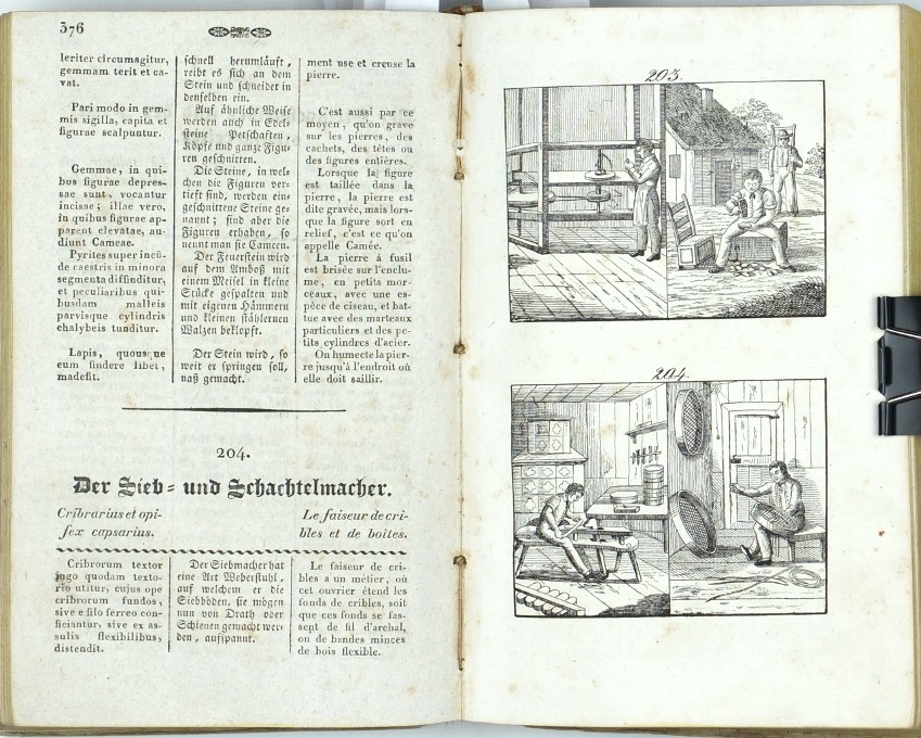(Komenský, Jan Amos). Gailer, Jacob Eberhard. "Neuer Orbis Pictus für die Jugend, oder Schauplatz der Natur, der Kunst und des Menschenlebens. mit genauer Erklärung in deutscher, lateinischer und französischer Sprache nach der früheren Anlage des Comenius bearbeitet und dem jetzigen Zeitbedürfnisse gemäss eingerichtet von ... Gailer. Nouvel Orbis Pictus ...". Reutlingen: Mäcken, 1833. 2. vydání. 8°. Rytý titul, (2) ll., VI, 586 str., 322 litografických illustrací na 162 tabulích. Třísloupcový tisk (latinsky, německy a francouzsky). Původní nakladatelská ilustrovaná papírová vazba.