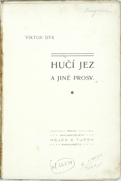 (Vojtěch Preissig). Dyk, Viktor. "Hučí jez a jiné prosy". Praha: Hejda a Tuček, (1903). 1. vydání. 8°. 178, (2) str. Obálka V. Preissig. OIlBrož.