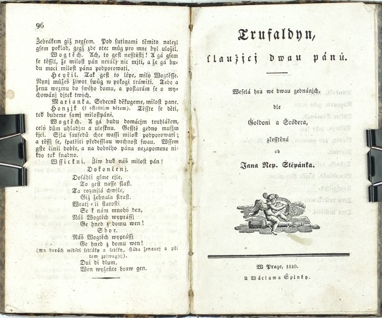 Štěpánek, Jan Nepomuk. "Marnotratnjk. Romantická kauzedlná bagka se zpěwy we třech gednánjch od Ferd. Raymunda zčesstěná od ... Štěpánka. Hudba od Konradyna Kreucera". "Trufaldyn, slaužjcj dwau pánů. Weselá hra we dwau gednánjch, dle Goldoni a Šrödera, zčesstěná od ... Štěpánka". Praha: Špinka, 1840. 2 knihy v 1 svazku. 8°. 96; 71, (1) str. Dobová polokož. vazba.