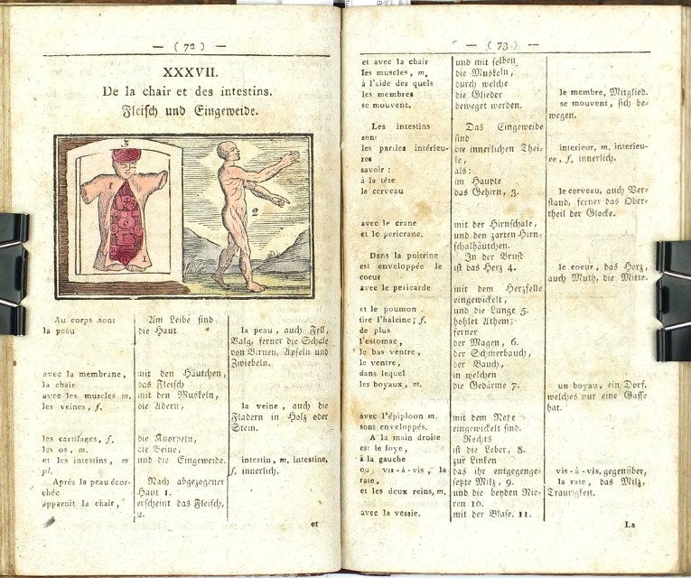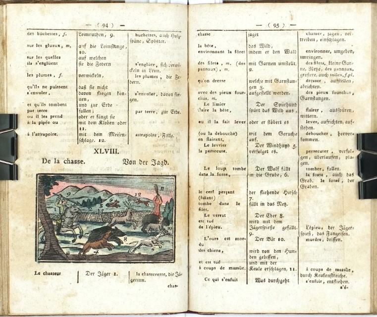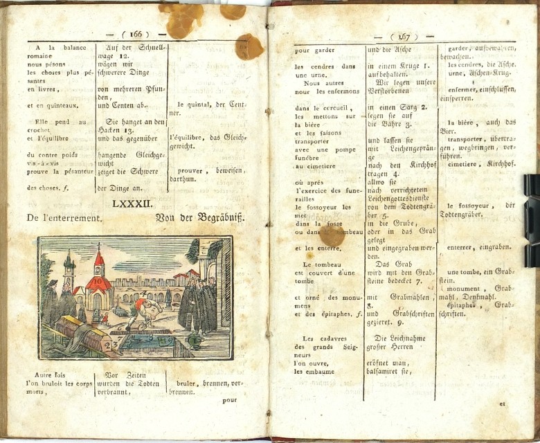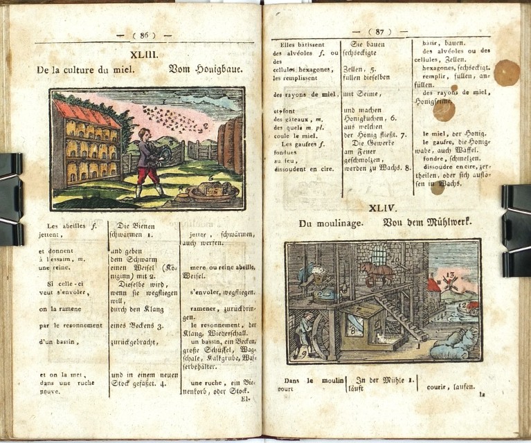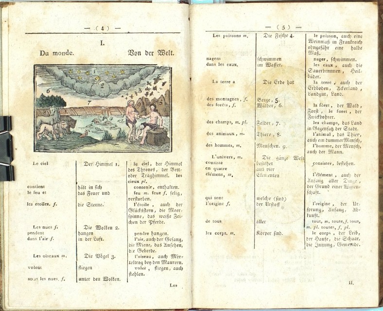 Komenský, Jan Amos - Hubert, C. J. von. "Comenius gallico-germanicus oder die Welt in Bildern französisch und deutsch. Für Anfänger in der französischen Sprache bearbeitet und herausgegeben von ... Hubert". Vídeň: A. Doll, 1817. 2. vyd. 8°. 168 str. se LXXXII staře kolorovanými dřevorytovými ilustracemi v textu. Dobová poloplátěná vazba.