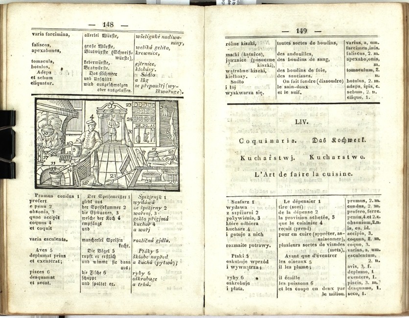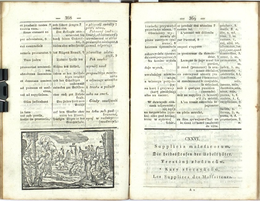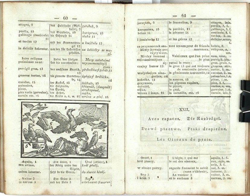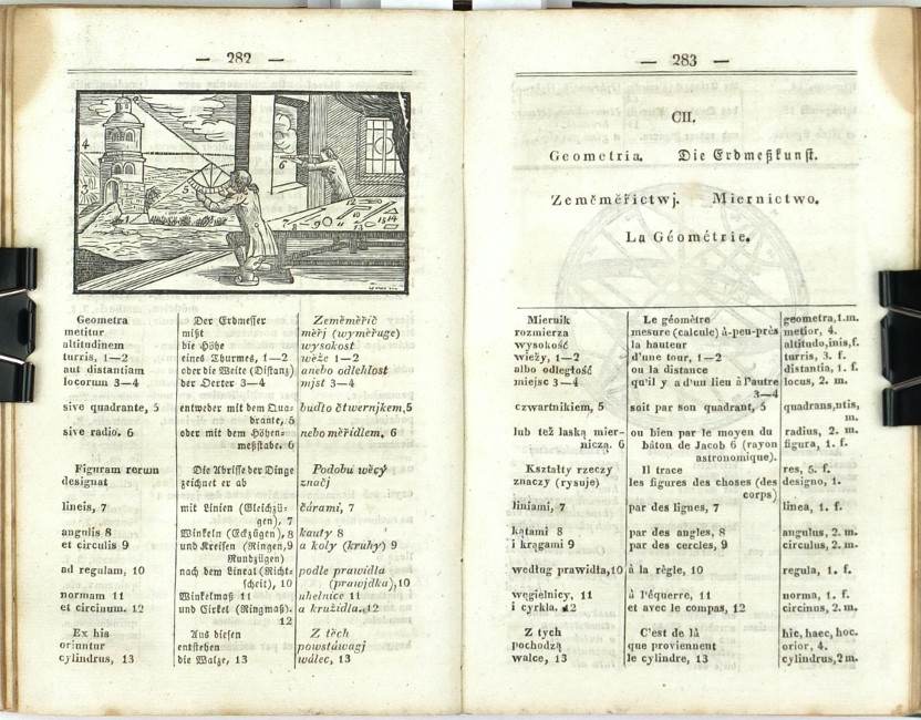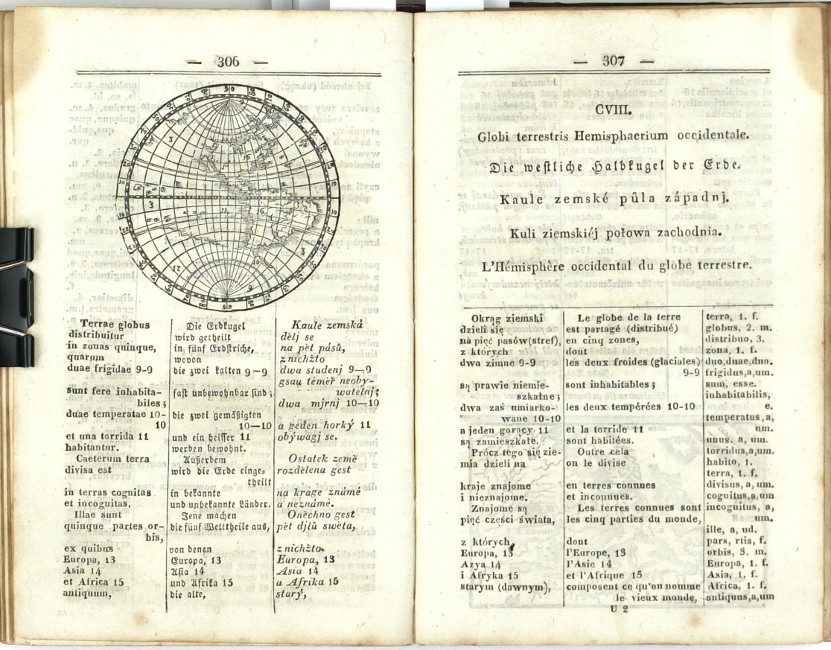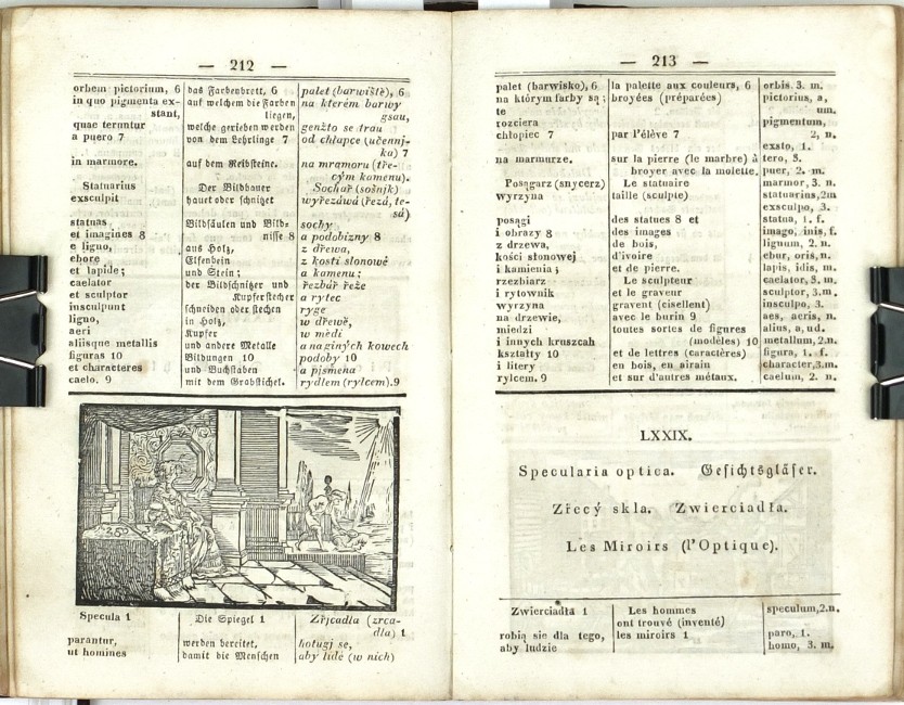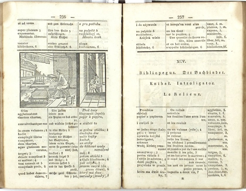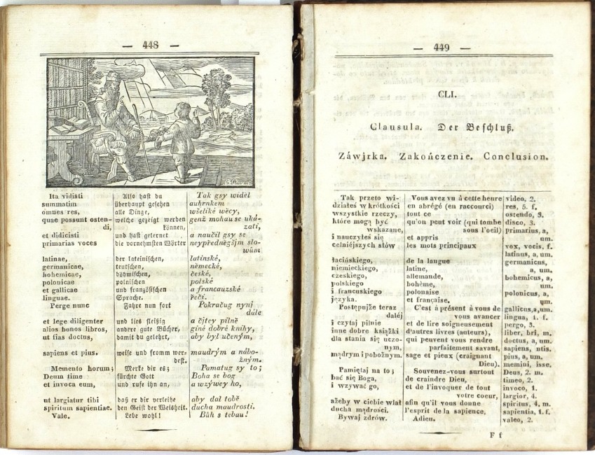 Komenský, Jan Amos (Comenius). "Orbis Pictus. Die Welt in Bildern. Swět v obrazých. Swiat w obrazach. Le Monde en Tableaux". Hradec Králové: J. H. Pospíšil, 1833. 8°. (2) ll., XVI, 454, (4) str. s vinětou na titulu a 54 dřevorytovými vyobrazeními (ryl G. Sturm) v textu. Šestisloupcový tisk (latinsky, neměcky, česky, polsky, francouzsky a lat. slovesa a podstatná jména v 1. osobě, resp. 1. pádě). Dobová polokožená vazba.