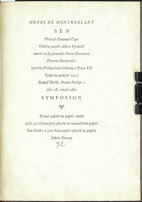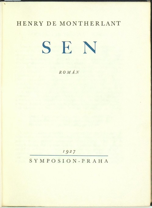 Montherlant, Henry de. "Sen. Román". Praha: Škeřík, 1927. Ed. Symposion, sv. 28. Přeložil E. Čupr. Návrh obálky Albert Vyskočil. Návrh vazby Hana Dostalová. 8°. 253, (2) str. Přednostní výtisk čís. 72/500 na papíře Japan Banzay. Pův. tlačená celokož. vazba se zlaceným titulem na hřbetu. Obálka brož. vydání vevázána.