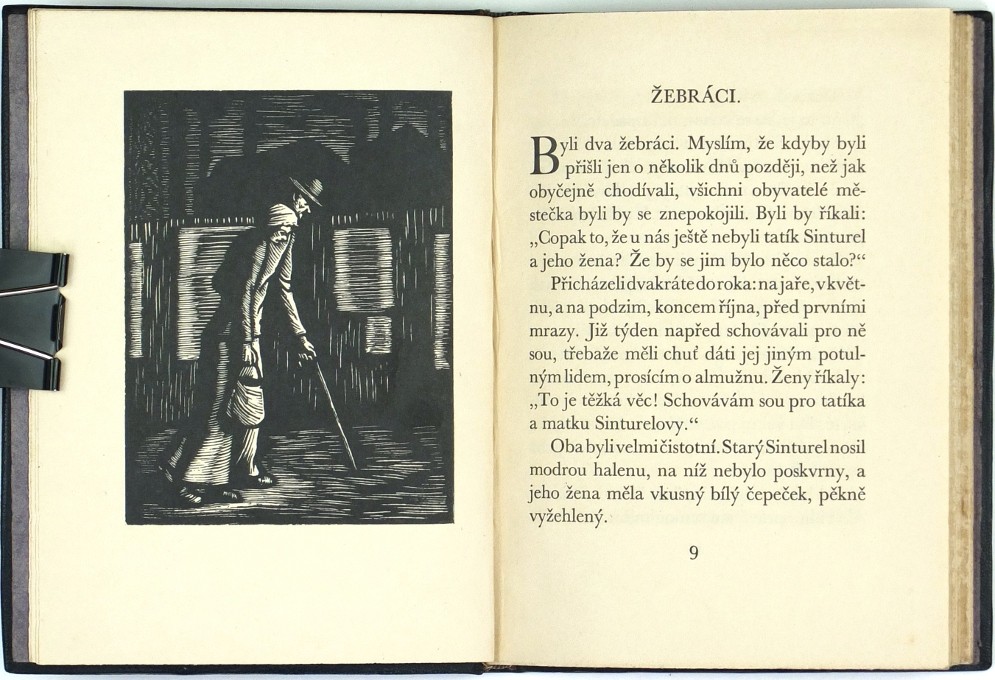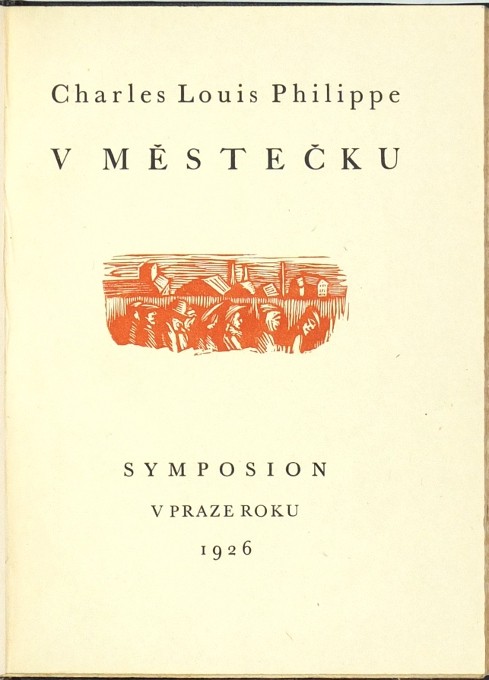 (Rambousek). Philippe, Charles Louis. "V městečku". Praha: Škeřík, 1926. Ed. 'Symposion', sv. 21. Přednostní výtisk čís. 108/500 na papíře Japan Banzay. 8°. 102, (2) str. Návrh vazby a 8 celostr. dřevorytů J. Rambousek. Pův. tlač. celokož. vazba.