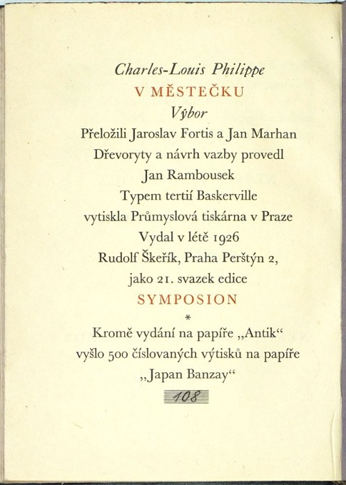 (Rambousek). Philippe, Charles Louis. ""V městečku". Praha: Škeřík, 1926. Ed. "Symposion", sv. 21. Přednostní výtisk čís. 108/500 na ručním papíře Japan Banzay. Přel. J. Fortis a J. Marhan. 8°. 102, (2) str. Návrh vazby a dřevoryty (8 celostránkových + viněty a značky) J. Rambousek. Původní tlačená celokožená vazba se zlaceným titulem na hřbetu.