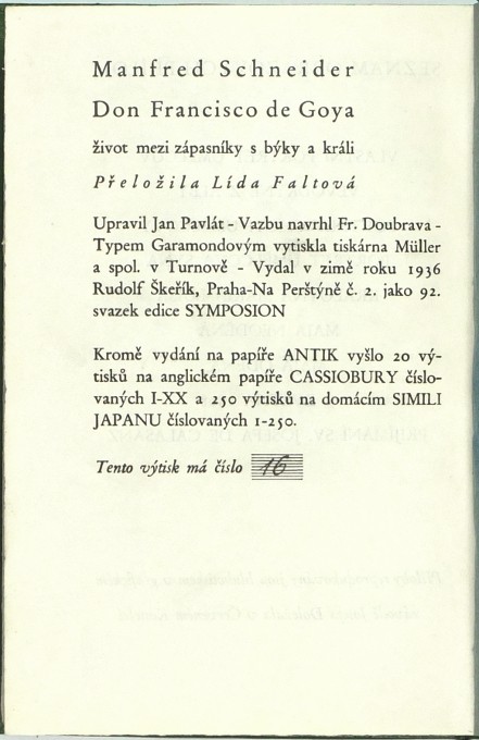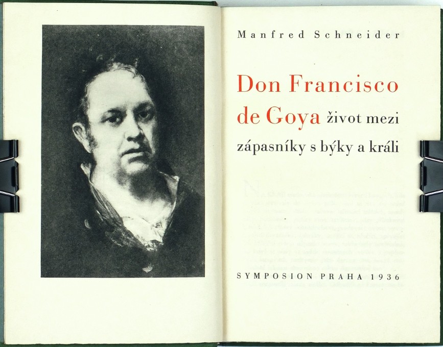 Schneider, Manfred. "Don Francisco de Goya, život mezi zápasníky s býky a králi". Praha: Škeřík, 1936. Ed. Symposion, sv. 92. Přel. H. Skoumalová. Návrh vazby F. Doubrava. 8°. 2405, (3) str., 8 obr. příloh + frontispis (všče reprodukce Goyových obrazů). Přednostní výtisk čís. 16/250 na domácím Simili Japanu. Původní tlačená celokožená vazba se zlaceným titulem na hřbetu.