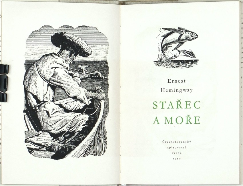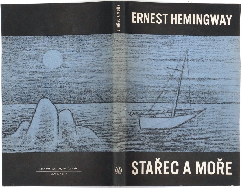 Hemingway, Ernest. "Stařec a moře". Praha: Československý spisovatel, 1957. 'Edice ilustrovaných novel', sv. 12. 8°. 113, (1) str. s množstvím ilustrací v textu (C. F. Tunnincliff, R. Sheppard). Přel. F. Vrba. Obálka a návrh vazby Zd. Seydl. O. celopl. vazba s obálkou.