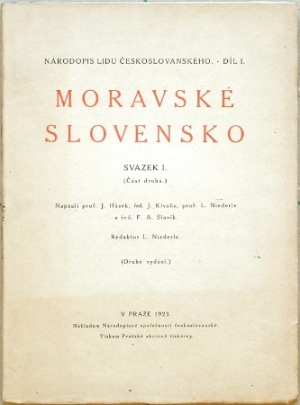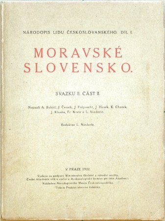 Moravské Slovensko. Niederle, Lubor (red.). "Moravské Slovensko. Svazek I. - II.". Napsali prof. J. Húsek, J. Klvaňa, L. Niederle, F. A. Slavík, J. Folprecht, Fr. Kretz, J. Černík. Praha: Národopisné Museum Českoslovanské, 1921-22 (Svazek II. Část I. - II.) a Praha: Národopisná společnost českoslovanská, 1923 (Svazek I. Část I. - II. - Druhé vydání). Ed. "Národopis lidu českoslovanského. Díl I.". Fol. Svazek I.: XV, 192 str. s 209 obr. v textu (fotografie tradičních stavení, obcí, krajiny, krojů), XXIX bar. tabulí (kroje); Svazek I. (Část druhá): 193-399, (1) str. s 325 obr. v textu, XXX-XL bar. tabulí, slož. mapa Moravského Slovenska; Svazek II.: VII, (1), 401-662, (2) str. s 442 obr. v textu, XLVII tabulí; Svazek II. (Část II.): 665-887 str. s 443-492 obr. v textu, XLVIII-LX tabulí. OBrož. s tituly na předních stranách obálek.