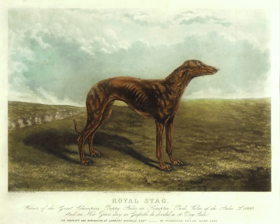 Chrt. "Royal Stag. Winner of the Great Champion Puppy Stakes at Kempton Park ...". Původní, staře kolorovaný lept s barevnou akvatintou. Podle vlastní kresby ryl Edwin Henry Hunt (1840-1925). Vyd. G. Rees v Londýně, 1883. S anglickým titulem a textem pod obrázkem. 32,5:46,5 cm (obrázek); 40:50 cm (výřez pasparty).