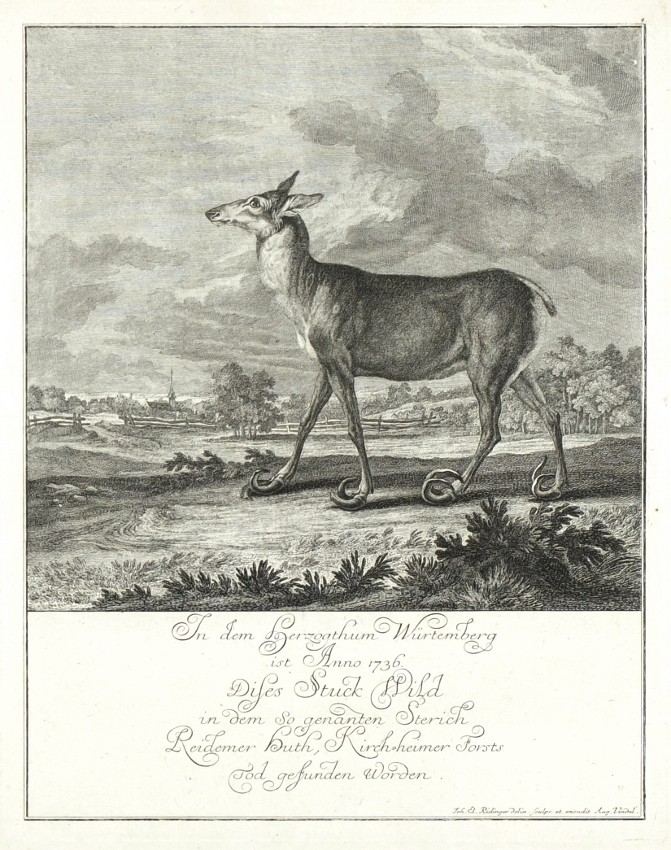 Ridinger, Johann Elias. Laň. "In dem Herzogthm Würtemberg ist Anno 1736 Dieses Stuck Wild in dem So genanten Sterich Reidemer Huth, Kirch-heimer Frost Tod gefunden Worden". Původní mědirytina. Podle vlastní kresby ryl a vydal J. E. Ridinger. Augsburg, ca. 1740. S německým titulem a textem pod obrázkem. 36,5:28 cm na papíře o rozměrech 45,5:32 cm.