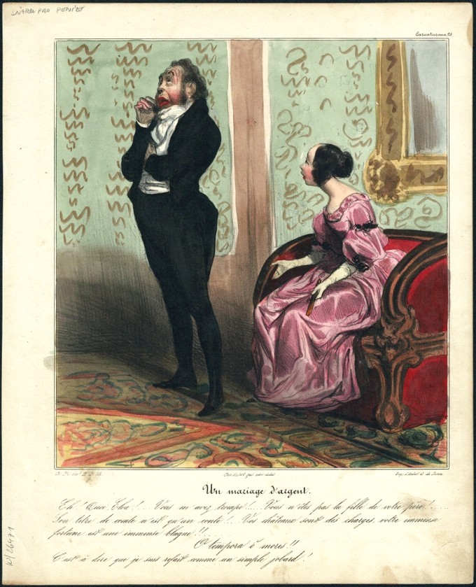 Daumier, Honoré (1808-1879). Sňatek pro peníze. "Un mariage d'argent". Původní, staře kolorovaná litografie, 1838. List čís. 26 z cyklu 'Caricaturana'. S titulem a 5 řádky francouzského textu pod obrázkem. 23,5:21,5 cm.