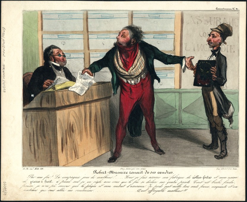 Text pod obrázkem (DeepL překladač): "Robert Macaire povstal z popela. Proboha! Ta společnost má smůlu! Včera jsem pojistil svou továrnu na superlepidlo a továrnu na křesadlové zámky, právě jsem s vámi vyřídil všechny záležitosti, když na čtyřech místech vypukl požár. Všechno shořelo, rozpustilo se, úplně se spálilo. Podařilo se mi zachránit jen ceduli a pojistku. Přišel jsem o sto tisíc tři sta franků a padesát jeden centim, které mi teď budete muset nahradit ... Jaká strašná tragédie!!"