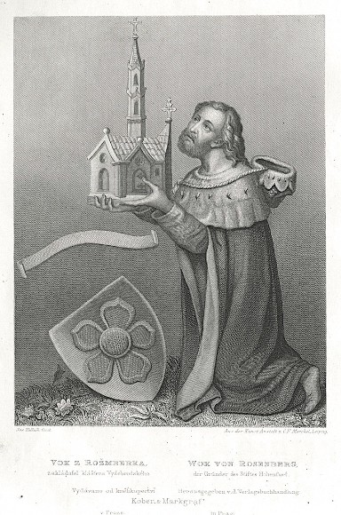 Petr Vok z Rožmberka. "Vok z Rožmberka, zakladatel kláštera Vyšebrodského. - Wok von Rosenberg ...". Původní ocelorytina podle J. Hellichovy kresby, F. B. Mikowec - 'Starožitnosti a památky země České', Kober a Markgraf, Praha, 1860. 15,5:11,5 cm.