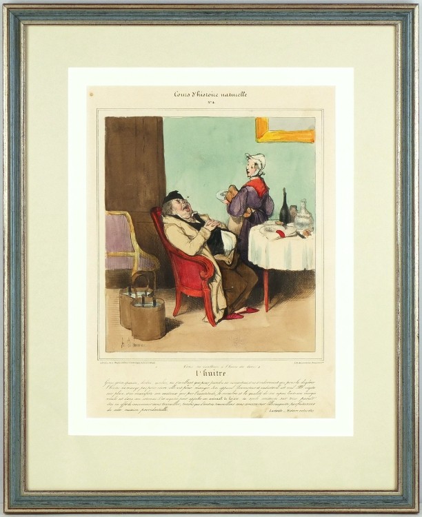 Daumier, Honoré. Satirický obrázek. "Cours d'histoire Naturelle. No. 4. '... Vous m'éveillerez á l'heure du diner.' l'huitre" (ústřice). Původní, staře kolorovaná litografie, Paříž, Dupin, 1837. S názvem cyklu nad obrázkem a titulem a 6 řádky fr. textu pod ním. Litograficky signováno v desce vlevo dole. 21,5:19 cm (obrázek).